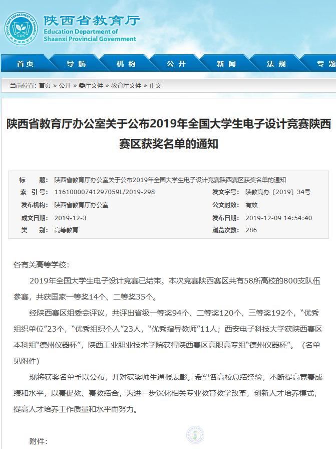 陕西省教育厅办公室关于公布2019年全国大学生电子设计竞赛陕西赛区获奖名单的通知链接请点击: