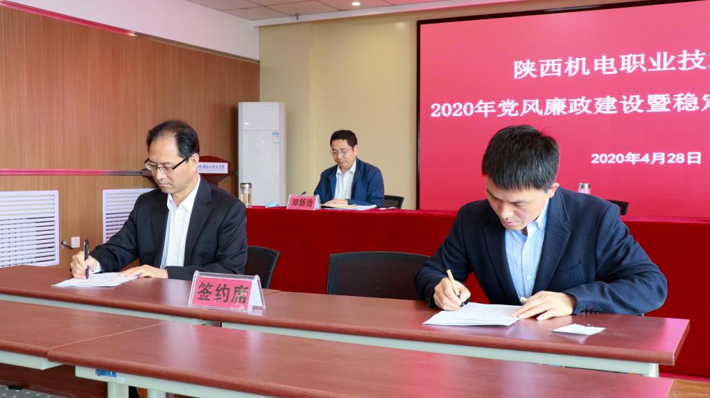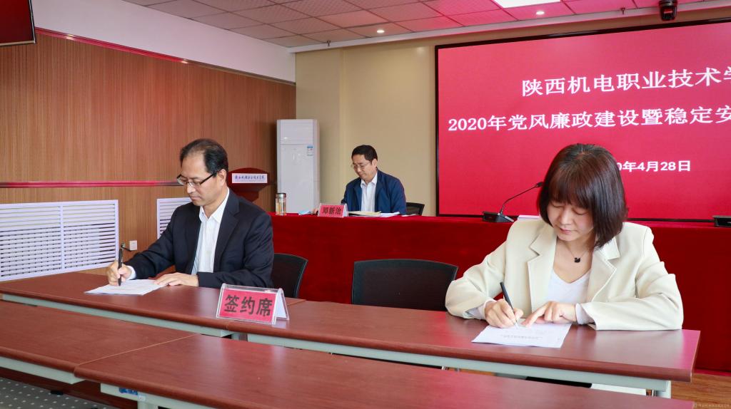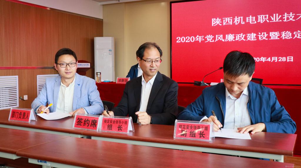 会上,党委书记伊逊智代表学院党委与分管领导、部门负责人代表签订《2020年陕西机电职业技术学院党风廉政建设责任书》。稳定安全领导小组组长伊逊智与稳定安全领导小组副组长张新堂、部门负责人代表签订《2020年陕西机电职业技术学院稳定安全工作责任书》。