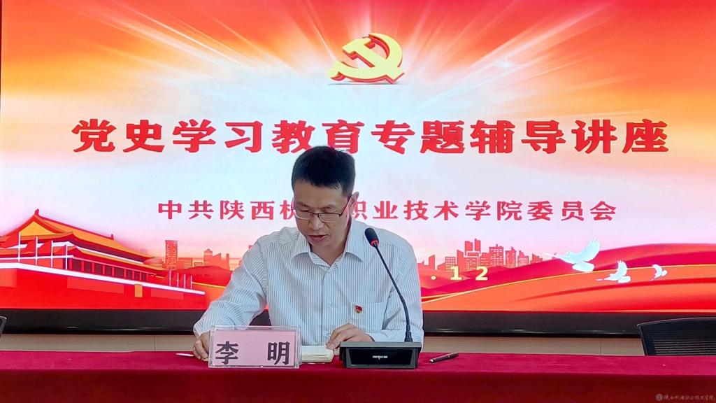 5月12日下午,陕西机电职业技术学院开展党史学习教育专题讲座。特邀宝鸡市委党校杨娟珍副教授为全校党员作题为《来之不易的选择——从社会主义建设史看道路自信》的讲座。党委宣传部部长、党史学习教育领导小组办公室主任李明主持。
