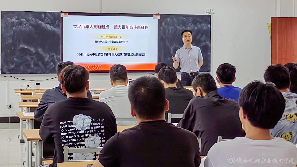 然后,张院长深入浅出、旁征博引,既富于理论性,又联系自身实际,着重从以下四个方面为大家展开解读:一是“镌刻史册的伟大飞跃,不可逆转的复兴进程”,张院长结合自己的求学经历并列举大量鲜活的事实案例,带领同学们回顾了党领导下的百年光辉历程,并时刻提醒同学们既要看到成绩也要看到差距,激励大家为建设制造强国而不懈奋斗,助力中国制造。二是“气象万千的伟大时代,浓墨重彩的崭新篇章”,他进一步引导同学们深化对新时代催生新思想的认识,深刻感悟新时代的历史性成就和历史性变革。三是“永葆初心的大党担当,伟大光荣的历史贡献”,他向同学们阐释了中国共产党是为人类进步事业而奋斗的政党,是永葆青春活力始终走在时代前列的有为政党。四是“弥足珍贵的精神财富,开创未来的行动指南”,在讲“十个坚持”时,他提到大国重器离不开智能制造,让同学们明白“国之重器”这个荣耀与他们的成长成才紧密相连。