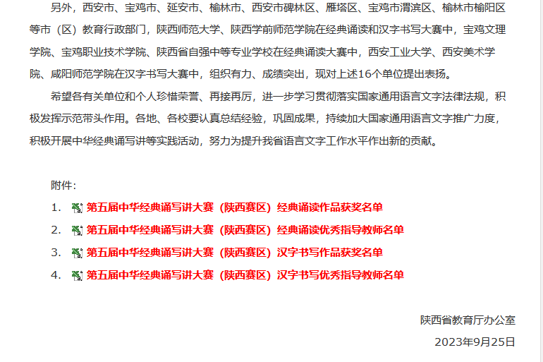 雅言传承文明,经典浸润人生。陕西省中华经典诵读大赛举办以来,我校高度重视、积极推动、广泛开展,为弘扬中华优秀传统文化,激发广大师生学经典、诵经典、用经典的热情提供了优质平台。本次比赛获奖,是我校始终坚持传承中华优秀传统文化,将文化育人贯穿教育教学全过程的丰硕成果。
