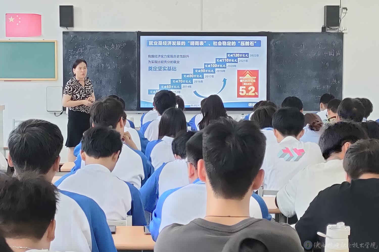 6月24日下午,陕西机电职业技术学院党委副书记、纪委书记陈红梅教授在博学楼318教室为23电气技术1、2班学生上形势与政策课,讲授《当前就业形势与实施就业优先战略》专题内容。