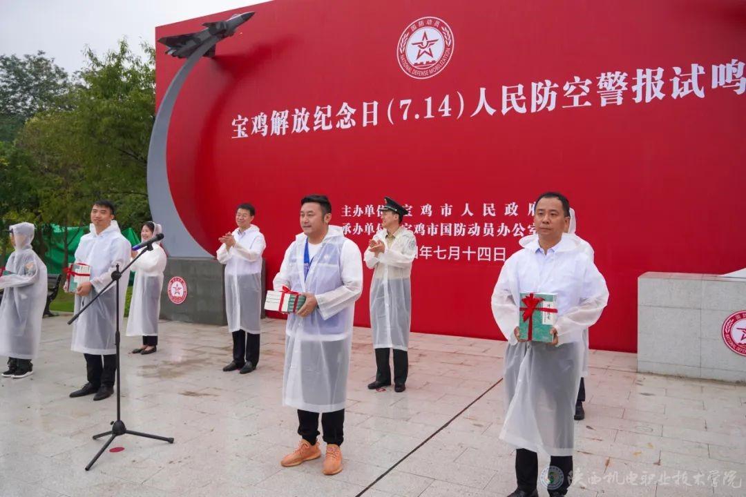 上午9时18分,随着一阵响亮的防空警报声划破长空,宝鸡市人民防空警报试鸣活动正式拉开帷幕。活动中,市委常委、宝鸡军分区司令员宋军政为新成立的无人机专业保障队进行了授旗仪式,我校电子信息学院院长高赋代表学校接旗,无人机产业学院副院长、陕西壹控智飞智能科技有限公司总经理李海涛代表学校接收捐赠的红色图书。